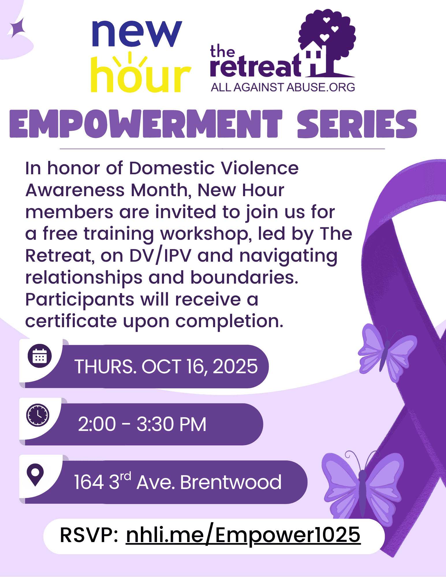 In honor of Domestic Violence Awareness Month, New Hour members are invited to join us for a free training workshop, led by The Retreat, on DV/IPV and navigating relationships and boundaries. Participants will receive a certificate upon completion.